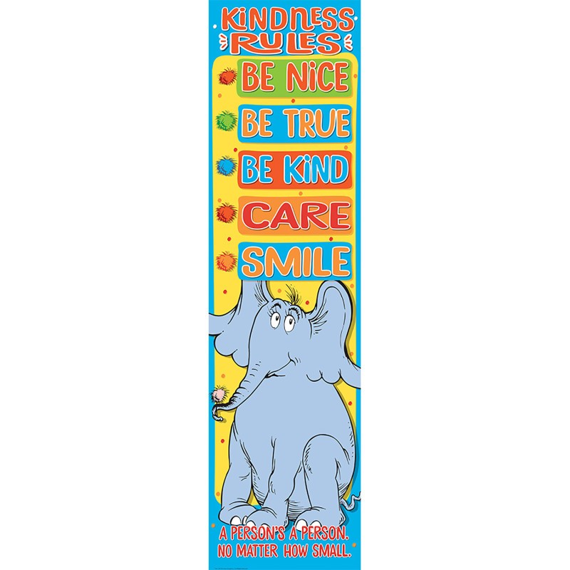 Teach kindness in your classroom with help from Dr. Seuss' Horton! This colorful banner measures 12" x 45" and is printed on heavy-weight card stock that's designed to be reused. A great choice for any classroom! Great for National Bullying Prevention Month!