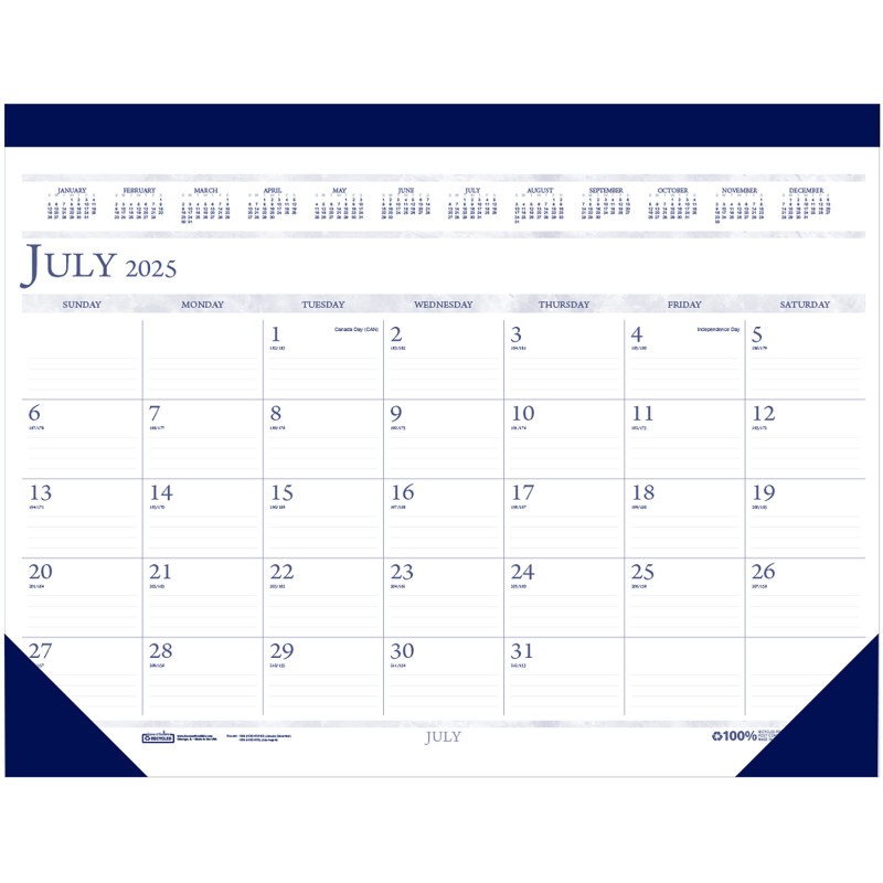 Attractive, academic (July to August), compact desk pad designed for the smaller workspace. Printed in blue and gray with blue leatherette binding. Months are perforated for easy removal. Block size: 2-1/4" x 1--3/4. Julian dates/days remaining. Faintly ruled daily blocks keep notes neat. Full year reference calendar on each month. Non-refillable. Printed on 100% post-consumer recycled paper with soy ink.