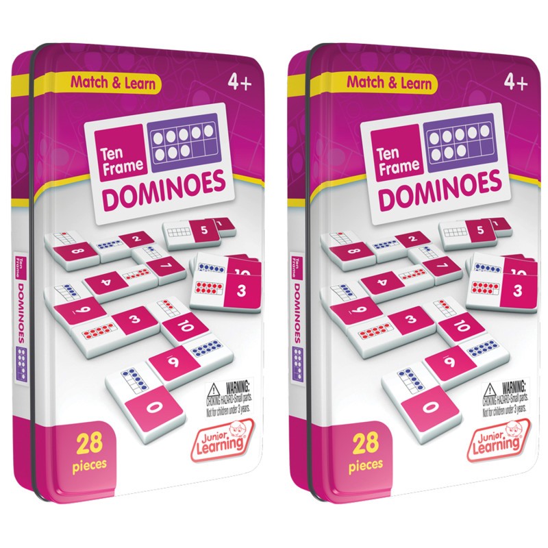Ten Frame dominoes include a 28-piece set of melamine dominoes. Dominoes come in a collectors tin for storage. Children will love the feel of real dominoes as they complete the number matching game. Sold as 2 complete sets of dominoes.