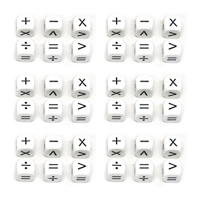 Koplow Games Math Operators Dice Set is a fun, hands-on way for students to learn basic math operation. Children learn more effectively when it is reinforced through play. Perfect for individual play, in small groups or as a classroom making these dice a great educational resource. Dice measure 16mm (5/8"). Each set includes 6 white opaque operator dice and feature symbols for addition, subtraction, multiplication, division, greater than/less than and equal to ( + , - , x , ÷ , > , < , = ). Sold as 6 sets for a total of 36 dice.