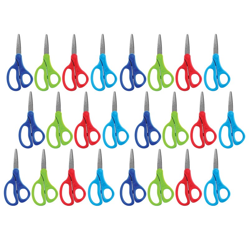 Maped Essentials Kids School Scissors are perfect for young students going back to school! Modern 5" / 13cm design features Pointed Tip Stainless Steel Blades with a rounded tip that is safer others you can find on the market and are much more appropriate for young students. Eye-catching asymmetrical handles are perfect size for young hands to hold, and are perfect for students 6+ years old. Sold as a pack of 24 in assorted colors: Blue, Light Blue, Red and Green (no color choice).