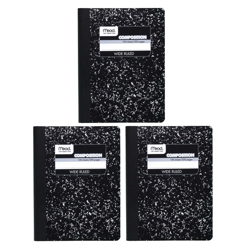 Mead Black Marble Composition Books are an old favorite with wide ruling that gives you plenty of space for writing. Features reference pages on the inside of both the front and back covers. Mead Black Marble Composition Book has 100 sheets for all your notetaking needs. Wide ruled white paper gives you plenty of space for writing. Class schedule on the inside front cover for easy scheduling. Multiplication tables, conversion tables and grammar rules on the inside back cover for quick reference. Composition book is durable with smooth, sewn binding that keeps pages permanently bound. Header of the front cover allows you to name or number each one. Page size is 9 3/4" x 7 1/2". Black marble cover. Sold as a pack of 3.