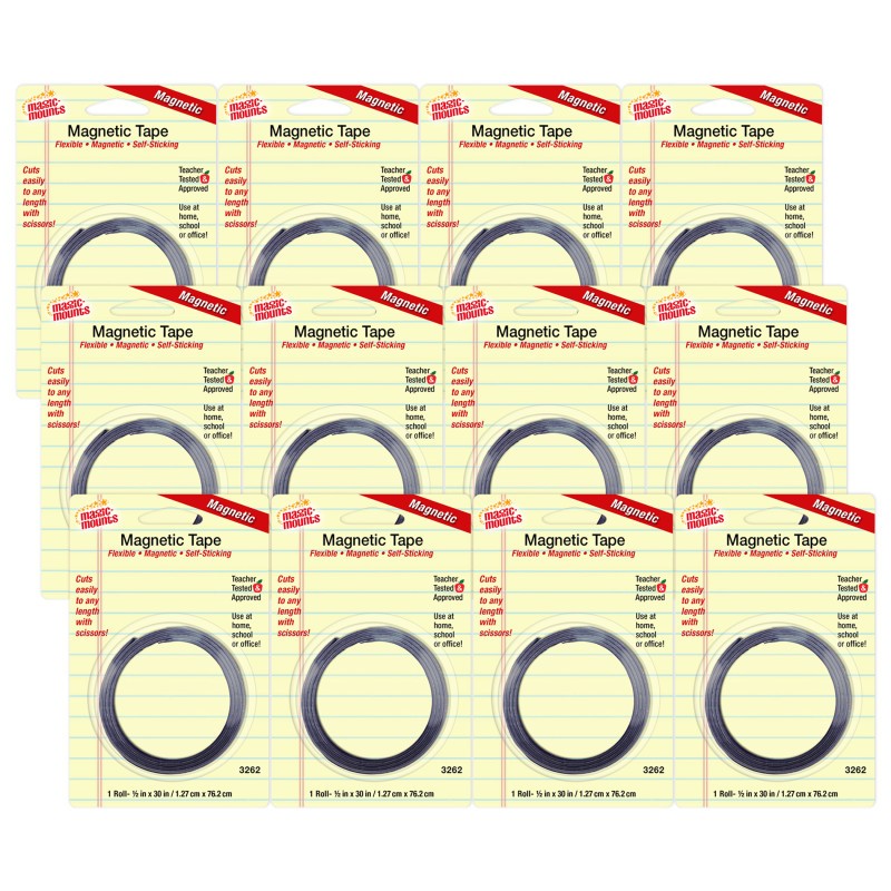 Magnet tape rolls are adhesive on one side and magnetic on the other. You can stick the adhesive side of the magnetic tape to an object. This can used for warehouse shelving, craft projects, hanging signs/displays or attaching tools to machines. Each roll measures 1/2" x 30". Sold as a pack of 12 rolls.