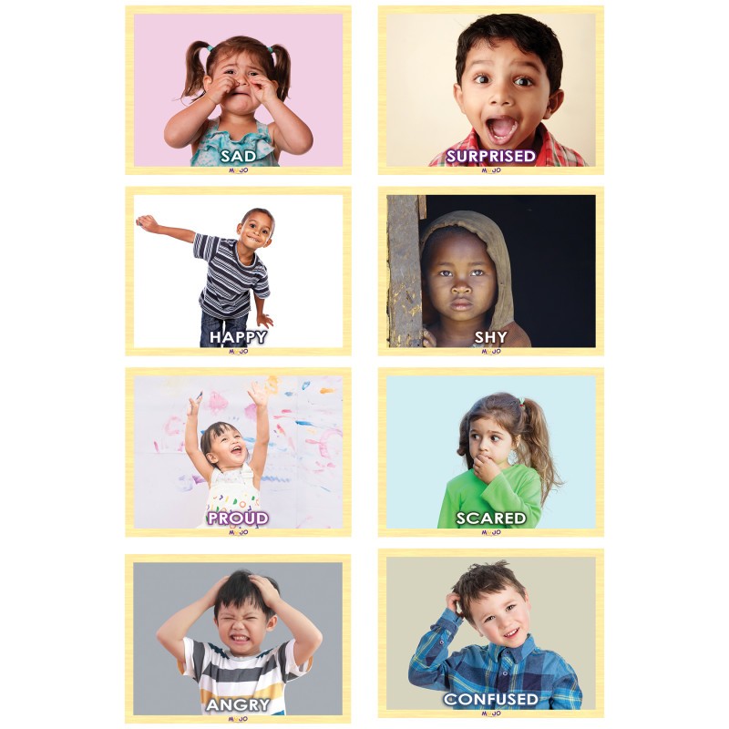 This set of eight wooden puzzles aids social-emotional learning by featuring a wide range of facial expressions and body language of children expressing different emotions
