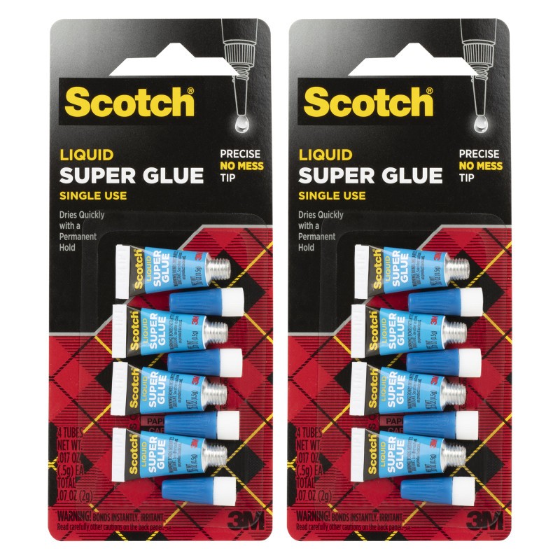Scotch® Single Use Super Glue Liquid delivers precision and power in a convenient, mess-free format. This fast-drying, strong adhesive is formulated to bond a wide range of porous and non-porous materials, including wood, metal, rubber, vinyl, leather, ceramics, and select plastics. Each pack includes four single-use tubes with a fine-tip applicator, providing just the right amount of glue for one application—eliminating waste and preventing drying out between uses. Ideal for quick household repairs, DIY crafts, and on-the-spot fixes. Sold as 2 pack. 4 per pack.