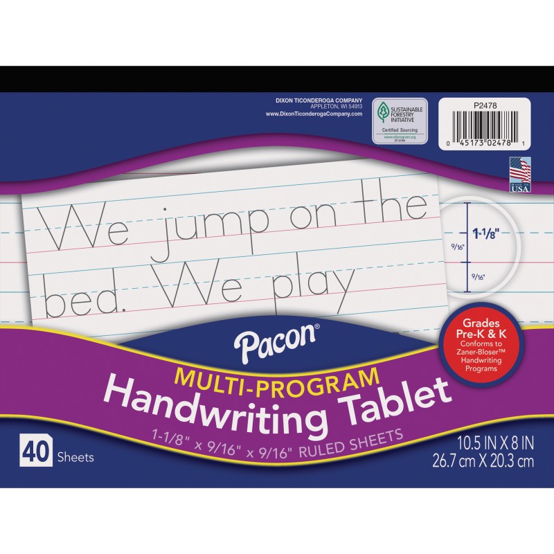 Our Pacon® Multi-Program Handwriting Papers offer rulings that conform to the Zaner-Bloser™ (Grade Pre-K and K) handwriting program. Bright tablet paper ruled both sides with red baselines, blue dotted midlines and blue headlines. Tablets have a heavy chipboard back and protective full page, four color, retail-friendly front cover. Recyclable. Ruling: 1-1/8" (long way). Dotted Midline: 9/16". Skip Space: 9/16". Includes 40 sheets. Measures 10.5" x 8".