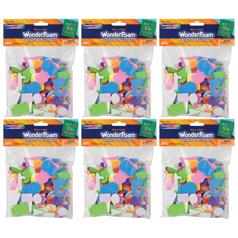 Creativity Street® WonderFoam® Peel & Stick Letters & Numbers are a fun and exciting craft addition for any project! With a variety of letters and numbers in easily manipulated foam that's both durable and lightweight, there's no crafting project that you can't accomplish. Thick enough for small hands to grab easily, these letters and numbers are a great learning tool! Add emphasis to school projects, greeting cards and crafts! Each pack includes seven assorted colors in Red, Yellow, Blue, Orange, Green, Purple and Pink and is broken out as follows: (10) sets of letters A, E, I, O, U, and (7) sets of remaining 21 letters and (7) sets of 10 numbers in 0-9. Sold as 6 packs for a total of 1602 pieces.