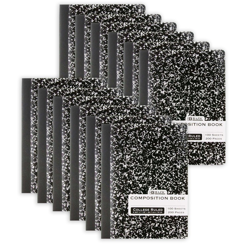 Black marble composition notebooks come with 100 sheets of college-ruled paper, ready for any assignment, and convenient for on-the-go use! Overall size: 9.75" x 7.5" inches. The inside front cover features a class schedule to keep you on track, while the inside back cover includes multiplication tables, conversion tables, and grammar rules for quick reference. The college-ruled format fits more lines per page and promotes neat, even lines of legible writing, with its double-sided feature providing plenty of note-taking space. Durable covers with secure sewn binding and stitched-in sheets ensure longevity. The sewn binding keeps notes securely held together and creates a smooth edge that won't catch on your clothing or backpack. It's great for students to take this notebook to their schools, colleges, and universities. A perfect product for writing all important notes, assignments, information, and other similar tasks. Sold as a pack of 12.
