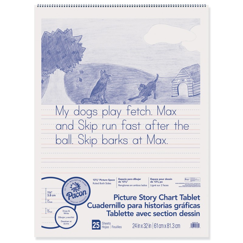 Pacon® Chart Tablets work great for classroom anchor charts. Designed to assist in classroom demonstration, this chart tablet can be used to help reinforce lessons being taught, and can also serve as a reference tool to help children with problem solving. This chart tablet is 1.5" ruled with a 0.75" dotted midline and 0.5" skip space and has a 13.625" picture story area at the top. Recyclable. Measures 24" x 32". Includes 25 sheets.