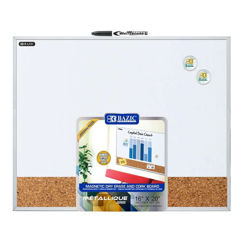 MAGNETIC WHITEBOARD AND CORK BOARD. Includes dry erase marker, 2 magnets, and 2 mounting screws. Smooth, scratch-resistant surfaces. White aluminum frame with bottom bulletin board to hang papers with push pins.