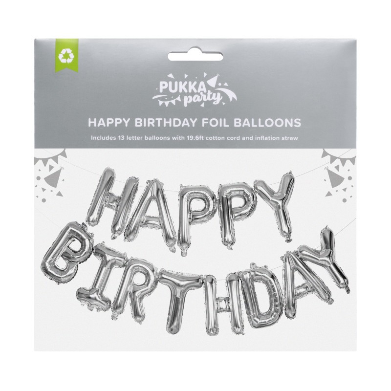 Make your birthday celebration sparkle with the Pukka Party Happy Birthday Foil Balloons set, designed to create a bold and stylish party backdrop. This elegant set includes 13 silver foil letter balloons, each approximately 16 inches tall, that spell out "HAPPY BIRTHDAY" in eye-catching metallic detail. Simple to inflate using the included straw, these air-filled balloons require no helium and are ready to display in minutes. The included 19.6 ft cotton cord allows you to hang the full banner easily on walls, windows, or as a striking photo booth backdrop. Each letter balloon measures up to 14.5 inches tall by 12.5 inches wide, ensuring a visually impactful display. Perfect for birthdays of all ages, this foil balloon set adds a sophisticated, Instagram-worthy touch to any celebration.