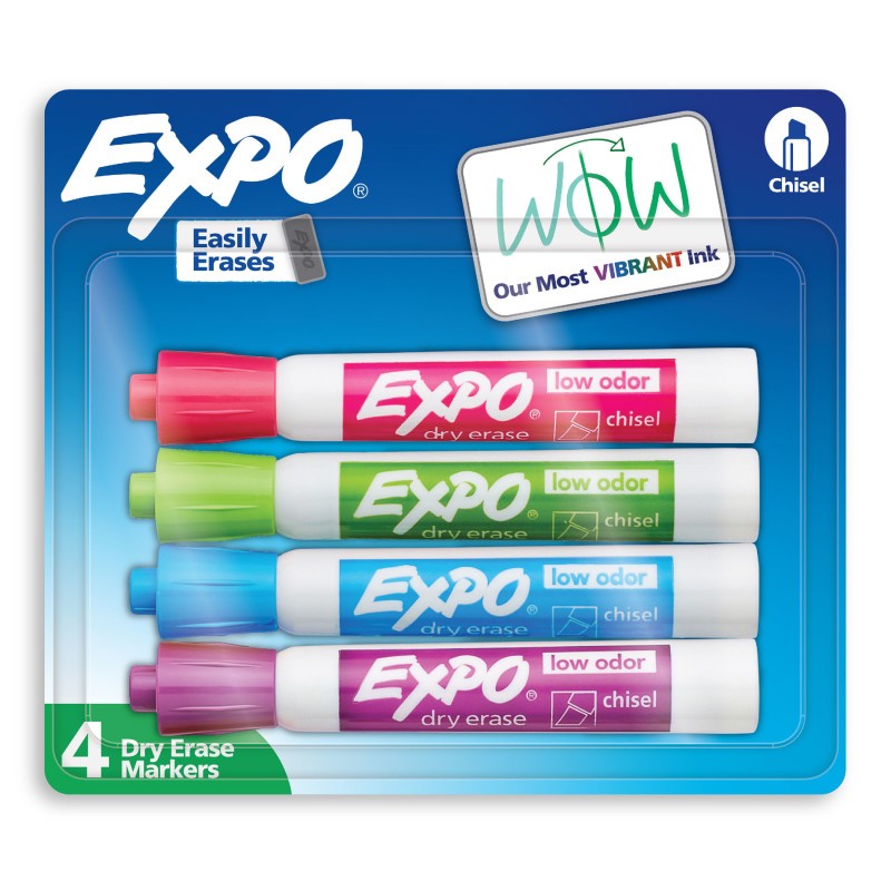 Capture ideas, share information, and organize life with vivid EXPO Dry Erase Markers! Now more vibrant than ever, this collection of EXPO markers helps everything come across clearly—from big ideas to fine details. The presentation markers are made for the whiteboard and beyond with ink that pops on glass, acrylic, and other clear, non-porous surfaces. They’re perfect for planning, presentations, lessons, calendars, home organization, and more! Plus, the wide range of colors of these whiteboard markers add versatility and personalization to any of your marking; you’ll be able to accent with a colorful doodle or sketch if you’re a teacher or parent! With an EXPO eraser or dry cloth, the ink erases cleanly and easily, so there’s little pause in any brainstorm session. And the low odor markers are great for classrooms, offices, and homes!