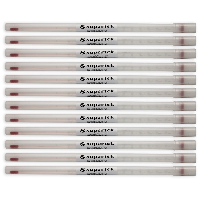This student grade red liquid thermometer is etched with 1 degree increments. Thermometer is shaped with an anti-roll triangle and is housed in a convenient re-usable plastic storage tube. White back 11-3/4" long. -20 to 110 C, 0 to 230 F, Partial Immersion Thermometer. Ages 13+. Sold as a pack of 12 thermometers.