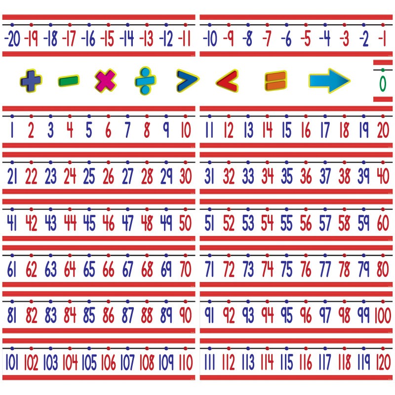 Use this versatile display to teach about even/odd numbers, positive/negative numbers, and math operations. 15 number line pieces, 8 accents, and a teacher's guide.