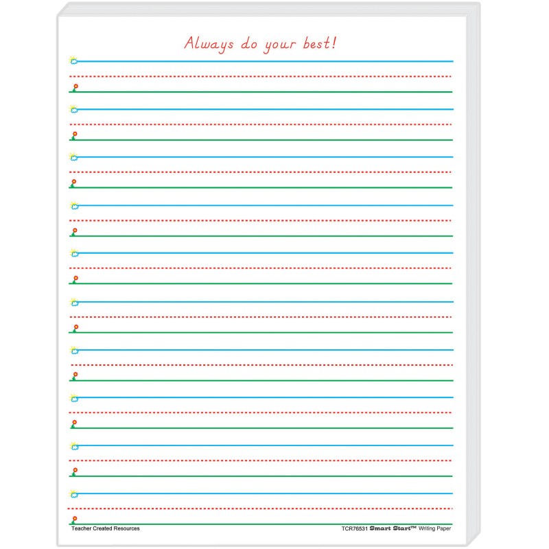 Smart Start Writing Paper (8-1/2" x 11") is truly a "Smart Start" for beginning and experienced writers. Bold graphics in blue, green, and red promote the feeling of success as children simply "Start at the Sky and pull down to the Ground" to form letters correctly. 1-2 Writing Paper lines have 5/8" spacing. Package includes 100 sheets.