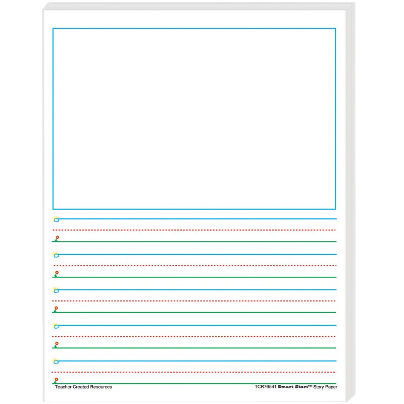 Smart Start Story Paper (8-1/2" x 11") is truly a "Smart Start" for beginning and experienced writers. Bold graphics in blue, green, and red promote the feeling of success as children simply "Start at the Sky and pull down to the Ground" to form letters correctly. 1-2 Story Paper has space for a picture and lines with 5/8" spacing. Package includes 100 sheets.