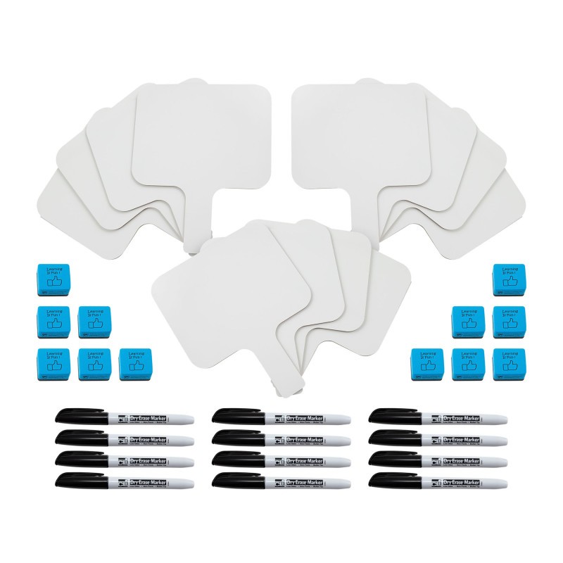 This class pack of dry erase paddles provides an interactive and reusable tool for classroom instruction, student participation, and quick assessments. Designed with a plain, one-sided dry erase surface, these paddles allow students to write answers, practice skills, and respond to questions in real time.The smooth dry erase surface supports repeated writing and erasing, making the paddles ideal for math practice, spelling, brainstorming, and formative assessment activities. Each set includes a dry erase paddle, marker, and eraser, giving teachers a complete, ready-to-use solution for group learning.