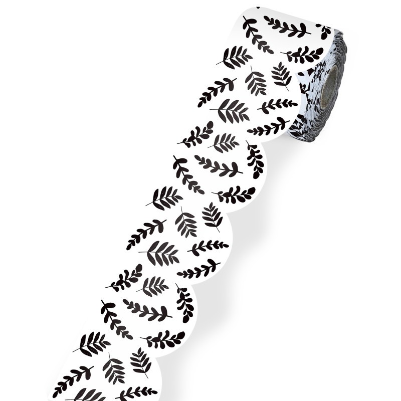 Add the perfect finishing touches to your modern farmhouse décor using Carson Dellosa's Farmhouse Black and White Leaves Bulletin Board Borders. The roll of scalloped, white and black border features a classically chic leafy design and measures 65 feet x 3 inches—perfect for bulletin boards, white boards, cork boards, and other modern farmhouse classroom décor needs. Cut and layer the white and black bulletin board border to add dimension to any display with ease. Add the white and black bulletin board borders to locker and desk décor, and other modern farmhouse classroom décor or office décor for year-round charm that students will love.