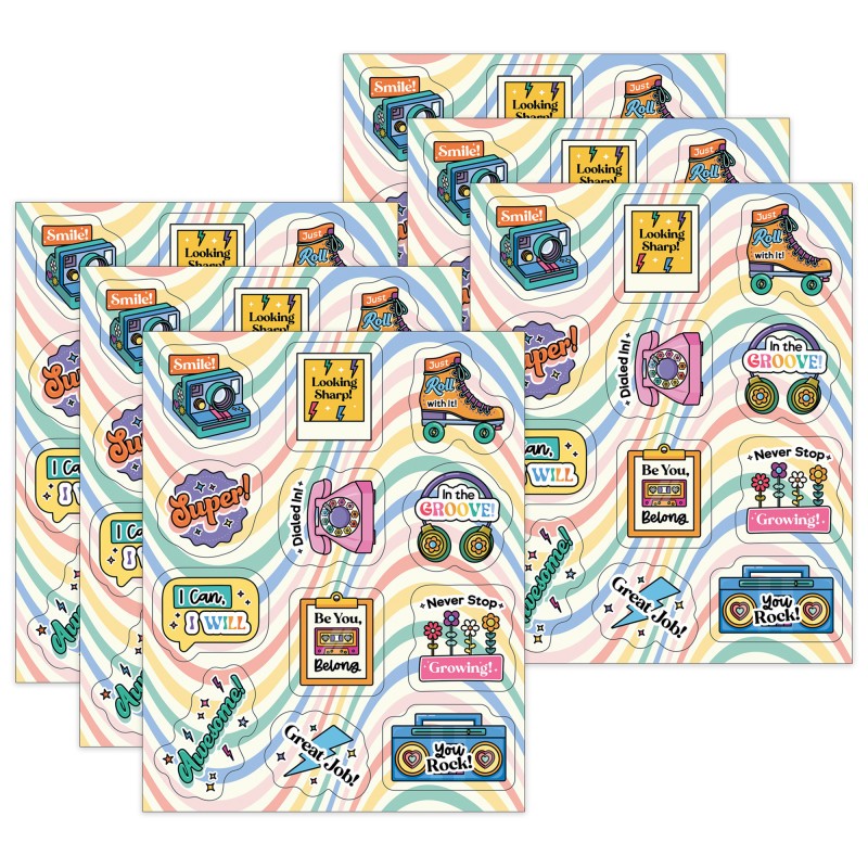 From reward stickers to stickers for crafts, there are so many groovy ways to use Retro Remix Rainbow Motivational Stickers! Each sticker pack includes 6 sheets of affirmation stickers (4.5" x 5.625") for a total of 72 inspirational stickers per pack. Acid-free and lignin free, each sticker features a 70s and 80s stickers aesthetic, including roller skates, boombox, and polaroid camera design, with a positive affirmation. Use the stickers for kids classroom prizes or on schoolwork to motivate students. You can also use the stickers for your classroom's reward chart or incentive chart! These rainbow stickers are great for crafts, 70s party decorations and 80s party decorations or party favors, sticker charts, reward systems for chores, potty training, and more! Retro Remix, designed by Stephanie and Loreal of @HappilyEverElementary, partnered with Carson Dellosa to bring some fun, retro vibes to your learning environment. Sold as 6 packs for a total of 432 stickers.