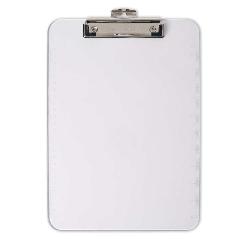 Stay organized and efficient with this clear letter-size clipboard made from tough, injection-molded plastic. Designed with smooth edges for comfort and durability, it features a low-profile clip with rubber grips to securely hold your papers in place without damaging them. A convenient pull-out hook on the back allows you to hang it for easy storage or display. Built right into the edge is a handy 12-inch ruler with inches on one side and centimeters on the other, making it a multifunctional tool for school, office, or job sites. Sleek, strong, and versatile, this clipboard is a smart solution for everyday tasks.
