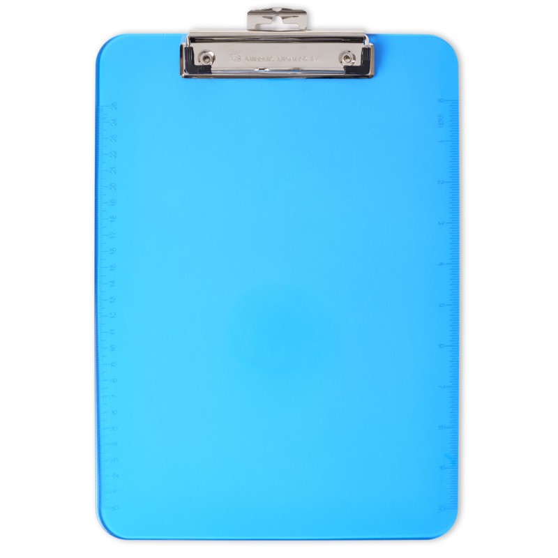 Clipboards are made of tough, durable injection molded plastic and feature smooth edges. Low profile clip with rubber grips holds paper securely. Pull-out hook allows for hanging. Clipboard also features a 12" ruler on the edge, inches on one side and centimeters on the other.