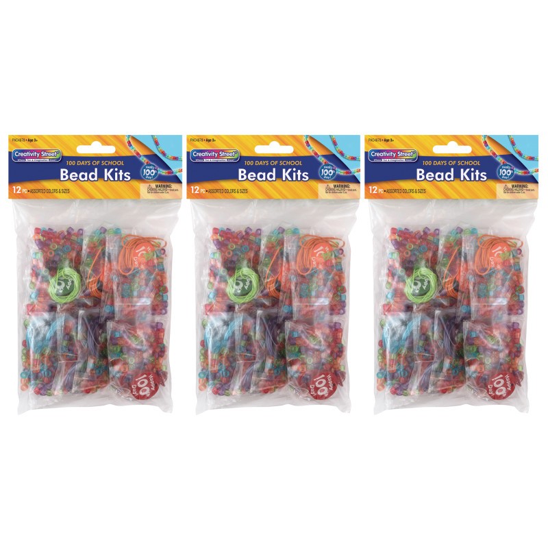 Creativity Street Bead Kit reinforces early math concepts and is a perfect craft project for the 100th day of school. Kit has beads in 5 colors that can be used to teach skip counting, sequencing and pattern making by offering lots of fun. kit comprises 105 beads with printed 100 day bead and 36' string individually packaged in polybag. 12 individually packaged bead kits feature color coordinate stringing cord, small beads and 100 Days medallion bead. Sold as 3 packs for a total of 36 bead kits.