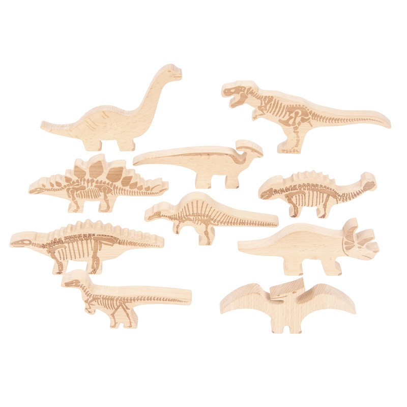 This set includes 10 wooden dinosaur blocks. Each block illustrates features on one side and a skeleton on the other. Explore the laser-indented markings for added tactile stimulation. Stamp the blocks into dough. The blocks are perfect for young children to learn about dinosaurs, engage in imaginative play and develop their descriptive language skills. Or, use them in lessons about the Prehistoric Era. This set is great for individual or group play. Made from durable beechwood, this set is designed to last for years. These thick blocks stand on their own. And they’re perfect for small hands to grasp. For ages 10m+. Sizes: 6.5"L x 0.6"W x 4.4"H - 4.75"L x 0.6"W x 2.25"H.