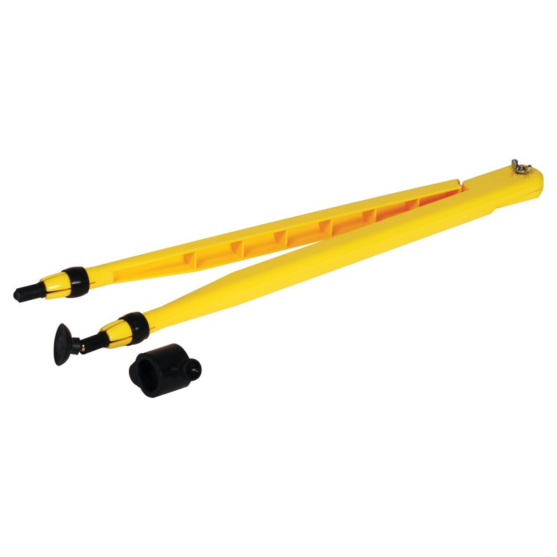 Draws circles over 50" in diameter for whiteboard or chalkboard demonstration. Constructed of quality plastic. Includes adjustable attachment for use with chalk or markers and attachments for various mounting possibilities such as suction cup, rubber tip, and steel tip. Legs measure 17" long. Rubber pad in joint helps lock the compass legs in place.