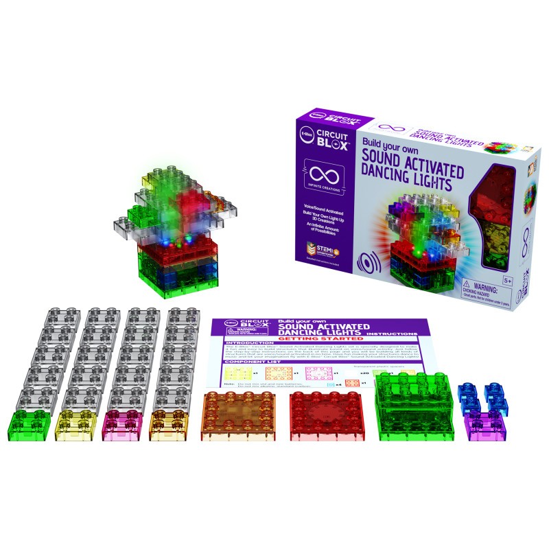 This kit provides hours of fun and educational play. The colorful building blocks contain electronic components such as a battery module, sound activation module and LED plate. And with additional transparent spacers you can build cool structures that illuminate to your voice or dance to sounds and music!