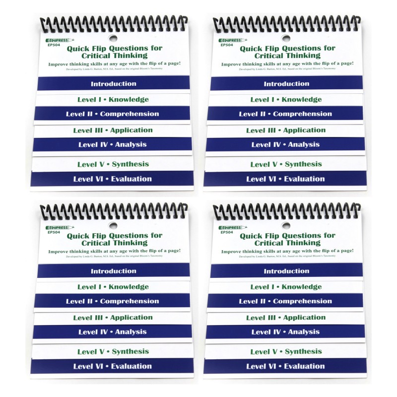 Hand-held flip charts make understanding learning theories and planning lessons easy! 5 x 6 inches. Take the mystery out of Bloom's Taxonomy with Quick Flip Questions for Critical Thinking. Learn how to ask questions, lead discussions, and plan lessons geared to each level of critical thinking. This hand-held flip chart helps improve thinking skills at any age. Teachers, parents, and students alike will find this an indispensable tool for improving communication, enhancing verbal skills, developing questioning skills, facilitating report writing, and developing higher levels of thinking. Sold as a pack of 4 identical flip charts.